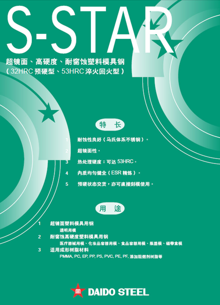 簡(jiǎn)要描述:日本大同S-STAR塑料模具鋼:超鏡面性淬火回火模具鋼(二次熔煉材料)...